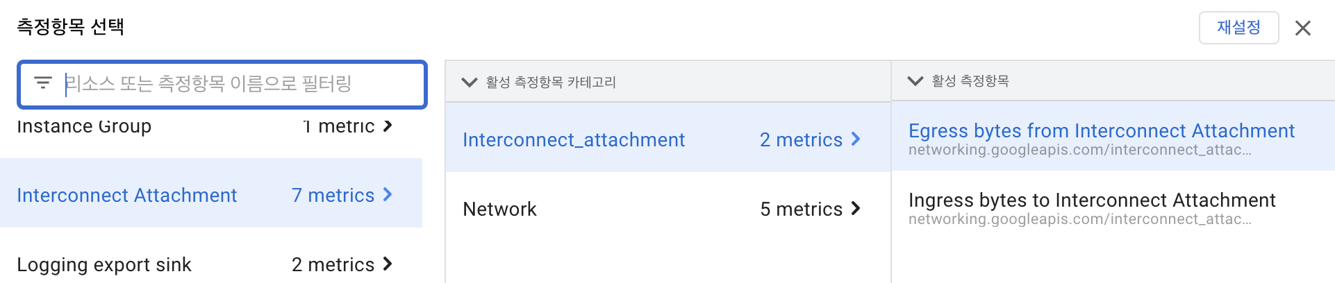 ㄴ 참고 : https://cloud.google.com/monitoring/api/metrics_gcp?hl=ko#gcp-networking > interconnect_attachment/vm/egress_bytes_count