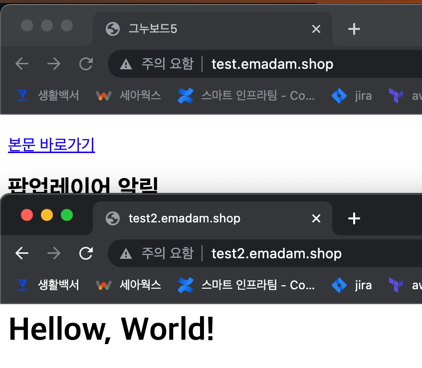 테스트를 위해 그누보드로 간단하게 샘플 어플리케이션과 VirtualHost (각각 test.emadam.shop, test2.emadam.shop)을 구성.