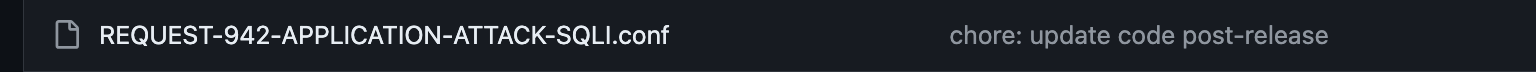 예시로 사전 정의된 규칙중 SQL 삽입(SQLi) 규칙 중 owasp-crs-v030301-id942100-sqli (libinjection을 통한 SQL 삽입 공격이 감지) 규칙을 찾아보겠습니다. 규칙 ID owasp-crs-v030301-id942100-sqli를 보면 중간에 id942100이라는 값을 확인할 수 있습니다. 이 값은 CRS의 규칙 ID값으로, 앞의 세 자리로 규칙 그룹을 찾을 수 있습니다. CRS Github Repository에서 규칙 ID의 앞 세 자리(942)가 포함된 파일을 찾습니다.
