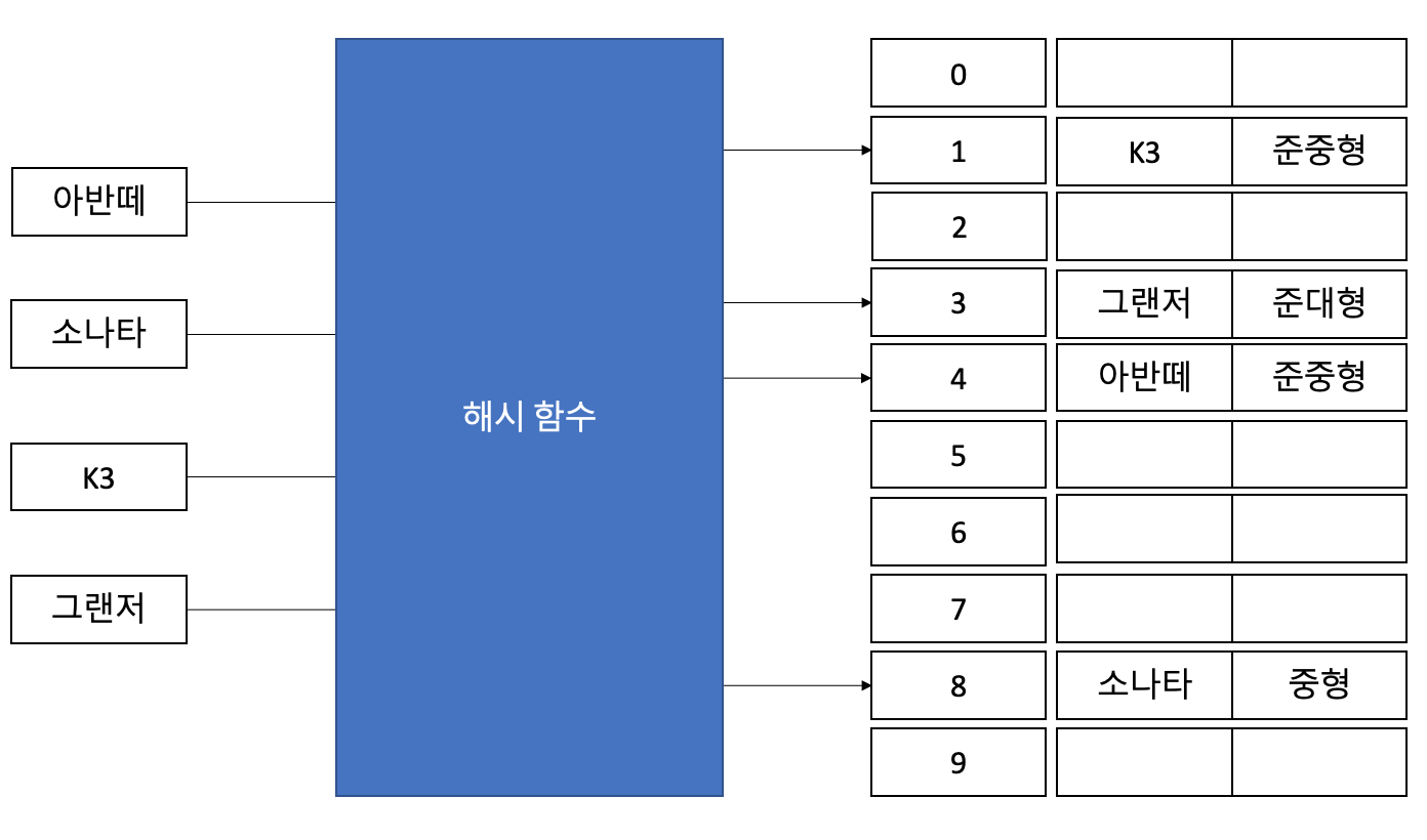 이 다음에는 차종(Key)을 해시 함수를 이용해 Index(0~9)로 매핑한다.