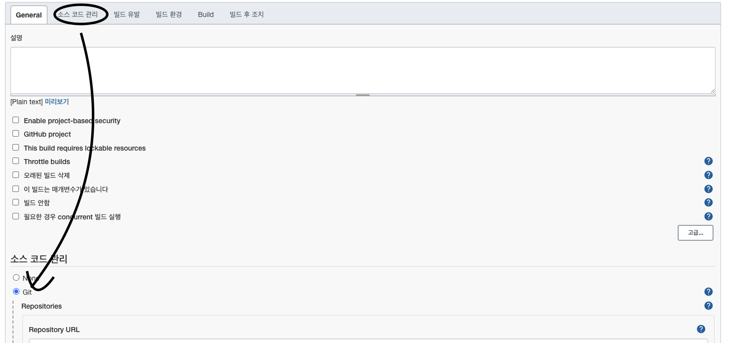 이후에 상세설정 화면이 나오는데 먼저 소스 코드 관리 탭으로 이동 후 Git을 선택하자