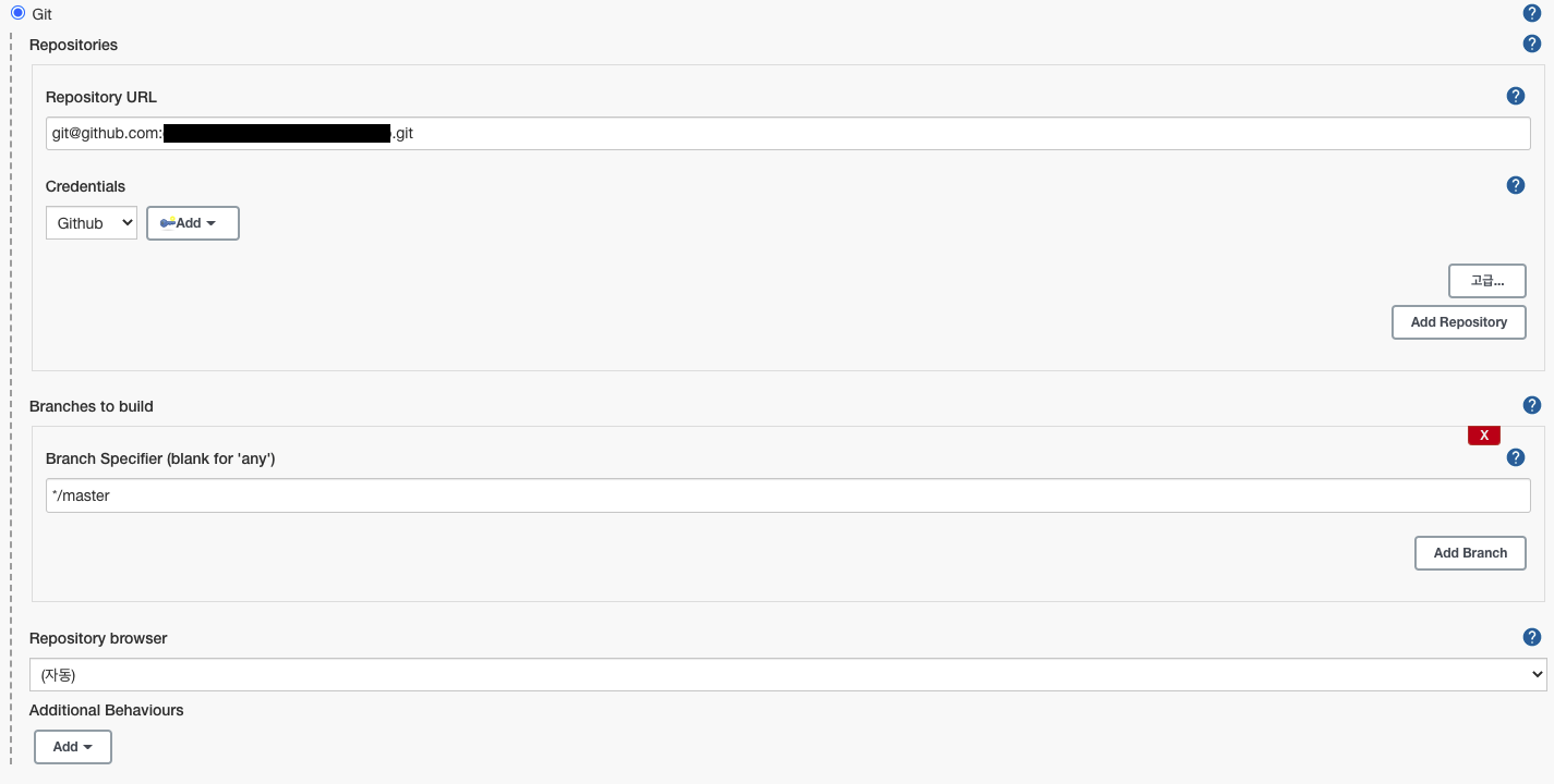 Repository URL: Repository URL을 입력하면 된다. 우리는 SSH 사용할 것이므로 Github에서 SSH clone경로를 복사해서 붙여넣으면 된다.