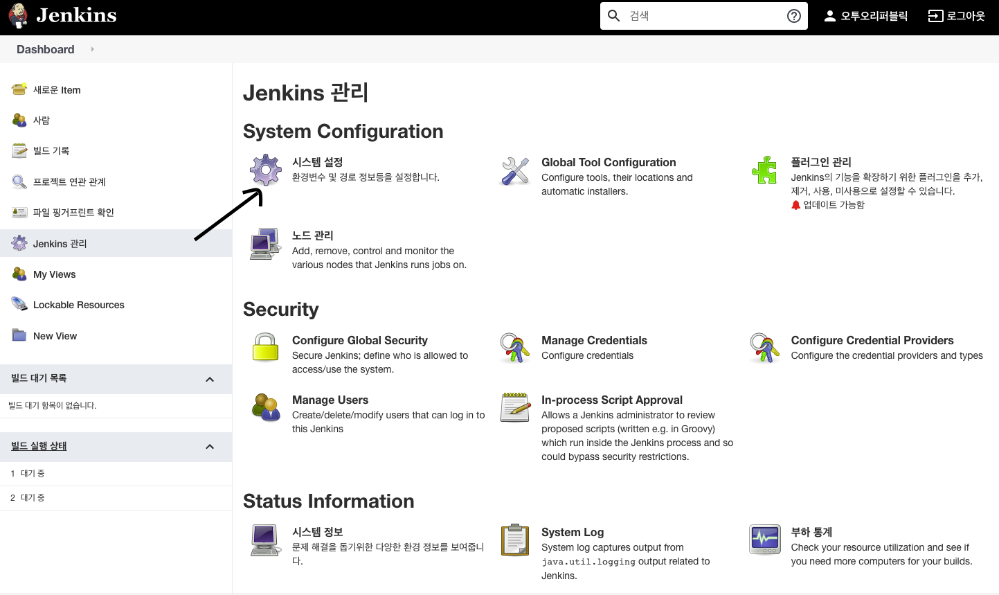설치가 완료 됐으면 Jenkins 관리의 시스템 설정으로 들어가자.