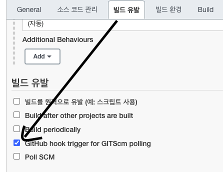 이후에 빌드유발 탭을 클릭 후 Github hook trigger for GITScm polling을 체크하자