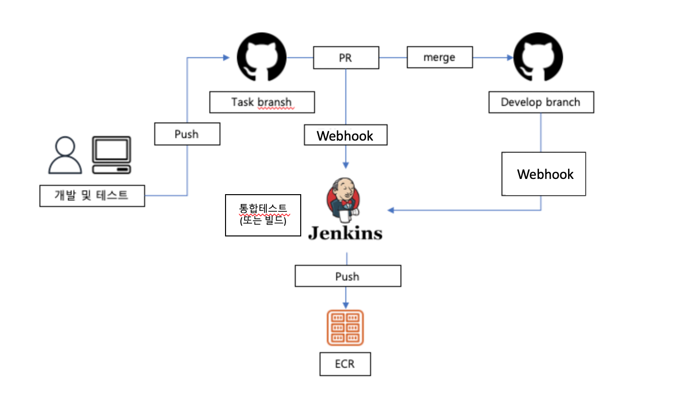 먼저 로컬에서 github repository를 remote하여 개발하다가 이슈 단위의 작업이 종료되면 Github의 Task branch에 Push 후 develop branch에 pull request한다. pull request시 jenkins에 webhook을 보내고 Jenkins에서는 pull request하고자 하는 애플리케이션의 통합테스트를 진행하고 진행결과를 Github에 반환해 merge 가능 여부를 체크한다. 통합테스트가 통과해 squash commit이 가능하면 내부적으로 코드 리뷰 후 squash merge를 진행한다. 그러면 다시 github으로 webhook를 보내 jenkins에서는 코드를 불러와 통합테스트를 진행하고 빌드 후 이미지화해서 ECR에 Push한다.