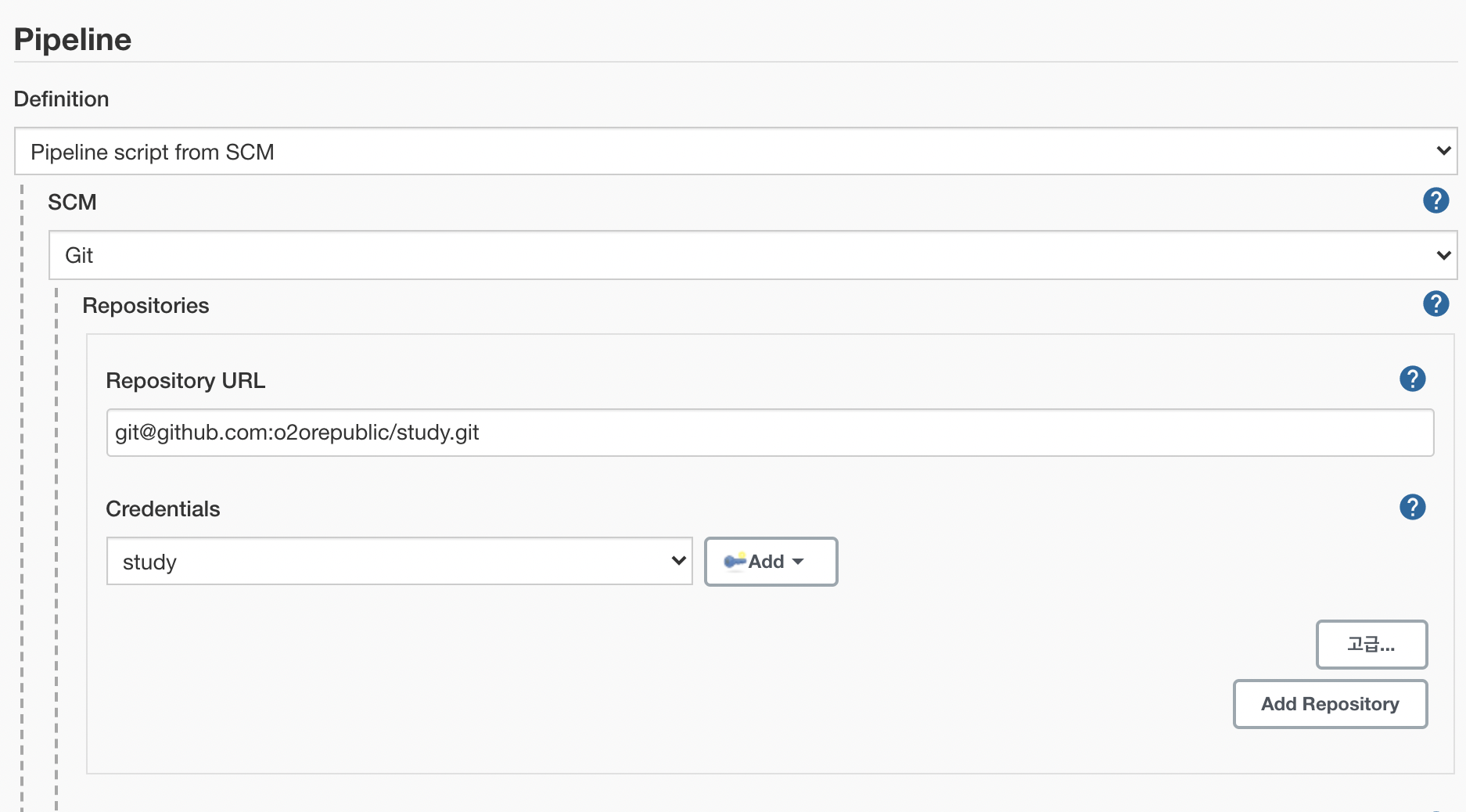 - Definition: Pipeline은 직접 jenkins에 script 파일을 작성할수도 있고 프로젝트에 pipeline script파일을 읽어서 실행할 수도 있다. 우리는 프로젝트에 Jenkins 파일(pipeline정의 파일)을 만들 것이므로 Pipeline script from SCM을 선택한다. (SCM은 Source Code Management의 약자로 Git이나 SVN같은 것들을 말한다.)