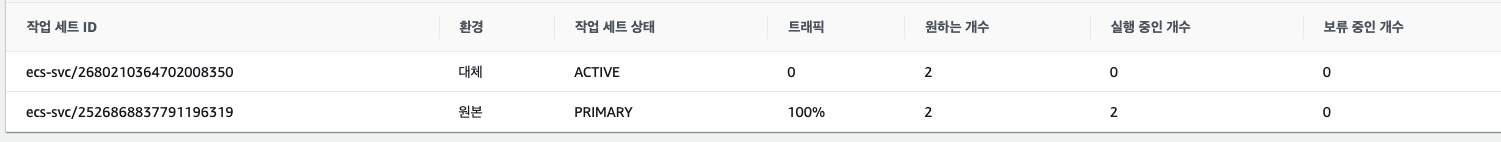 배포를 시작하면 위 사진처럼 된다. 기존에 listener와 연결되어 있던 대상 그룹에 그대로 2개의 작업이 실행 중이며 트래픽도 100% 가고 있다. 이 시점에서는 새로운 배포버전이 대기중인 대상 그룹(위에서 봤던 사용하지 않는 상태로 유지되던 대상그룹)으로 묶여 배포된다.